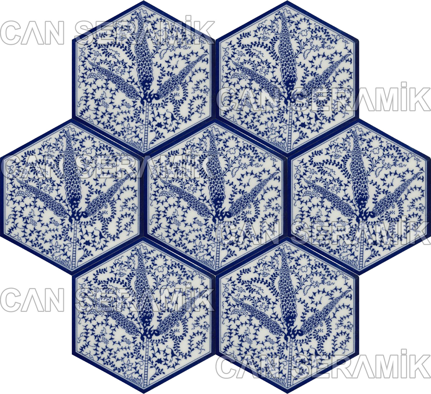 Altıgen İznik Çinisi ürünlerimizin alt yapısı seramiktir . Üst yüzeyi ise parlaktır . Modern alt yapıya geleneksel Türk çini sanatı motifleri serigraf baskı ile basılarak üretim yapılmaktadır . Ürünümüzün ölçüsü yazıldığı gibi genellikle 20×23 cm. gelmektedir ancak fırında pişme esnasında karo çekme veya salma yapabilir . Ölçü 19,8*22,8 ya da 20,2*23,2 gibi ölçülerde gelebilir ve bu durum seramik standartlarına uygundur. Her renk tek bir elekte basılır üst yüzeyine vetroze dediğimiz toz halinde camdan bir tabaka koyulur ve daha sonra fırına verilir .